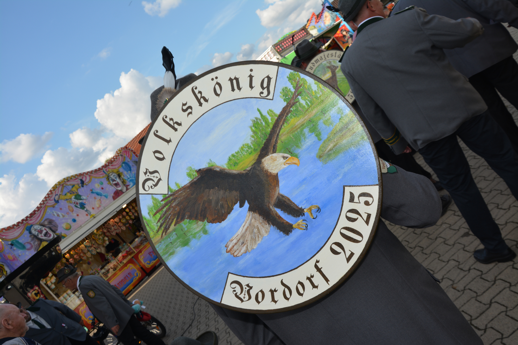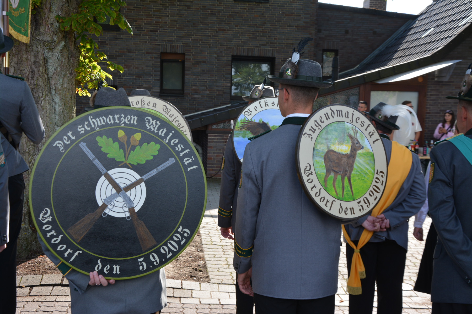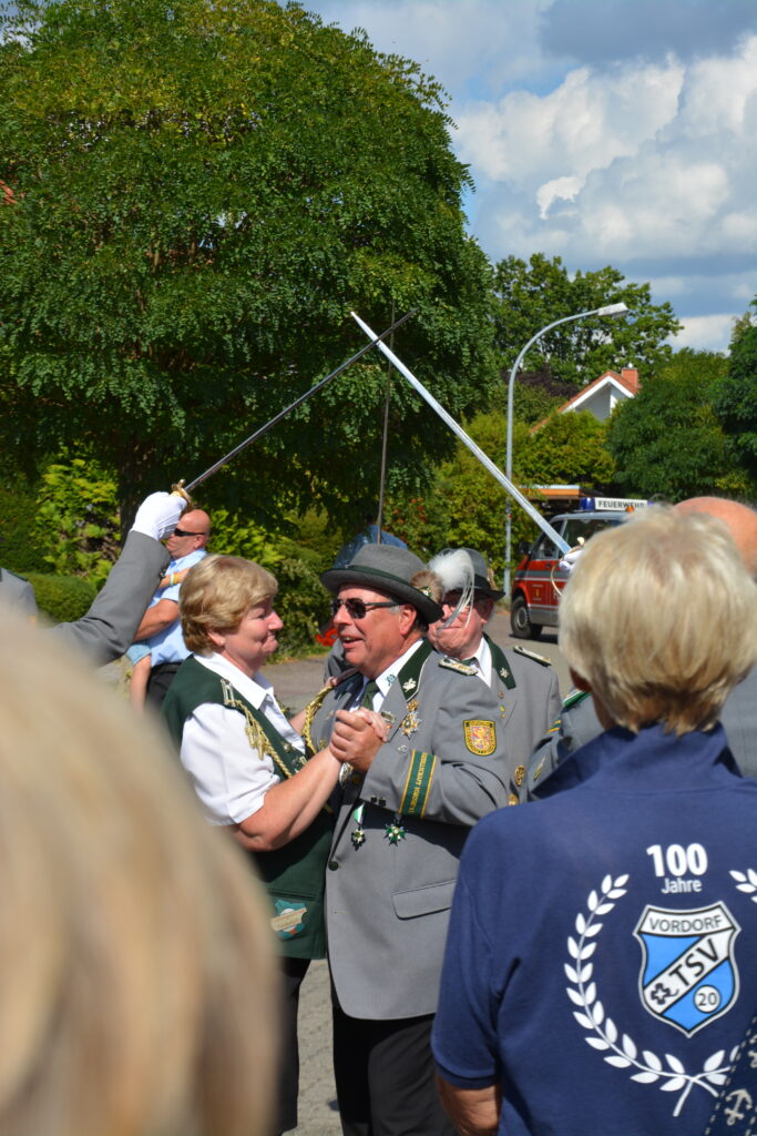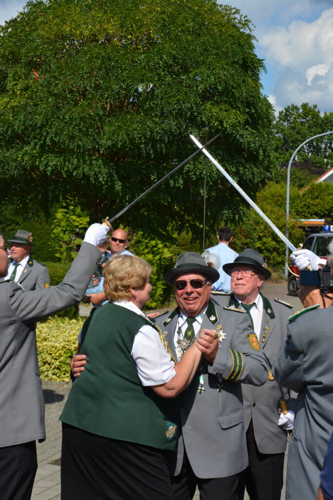 Nach dem Ehrentanz der neuen Würdenträger und dem Fotografieren des neuen Königshauses setzte sich der Umzug wieder in Bewegung. Zuerst wurde die Scheibe der Schwarzen Majestät Mario Heine angebracht und mit Säbeltanz und Kaltgetränken angemessen zelebriert. Nun ging es weiter zum Jugendkönig Bennet Busch. Auch hier wurde die Scheibe der Jugendmajestät fachmännisch angebracht und mit kaltem Wolters begossen. Nun ging es zurück auf den Festplatz.