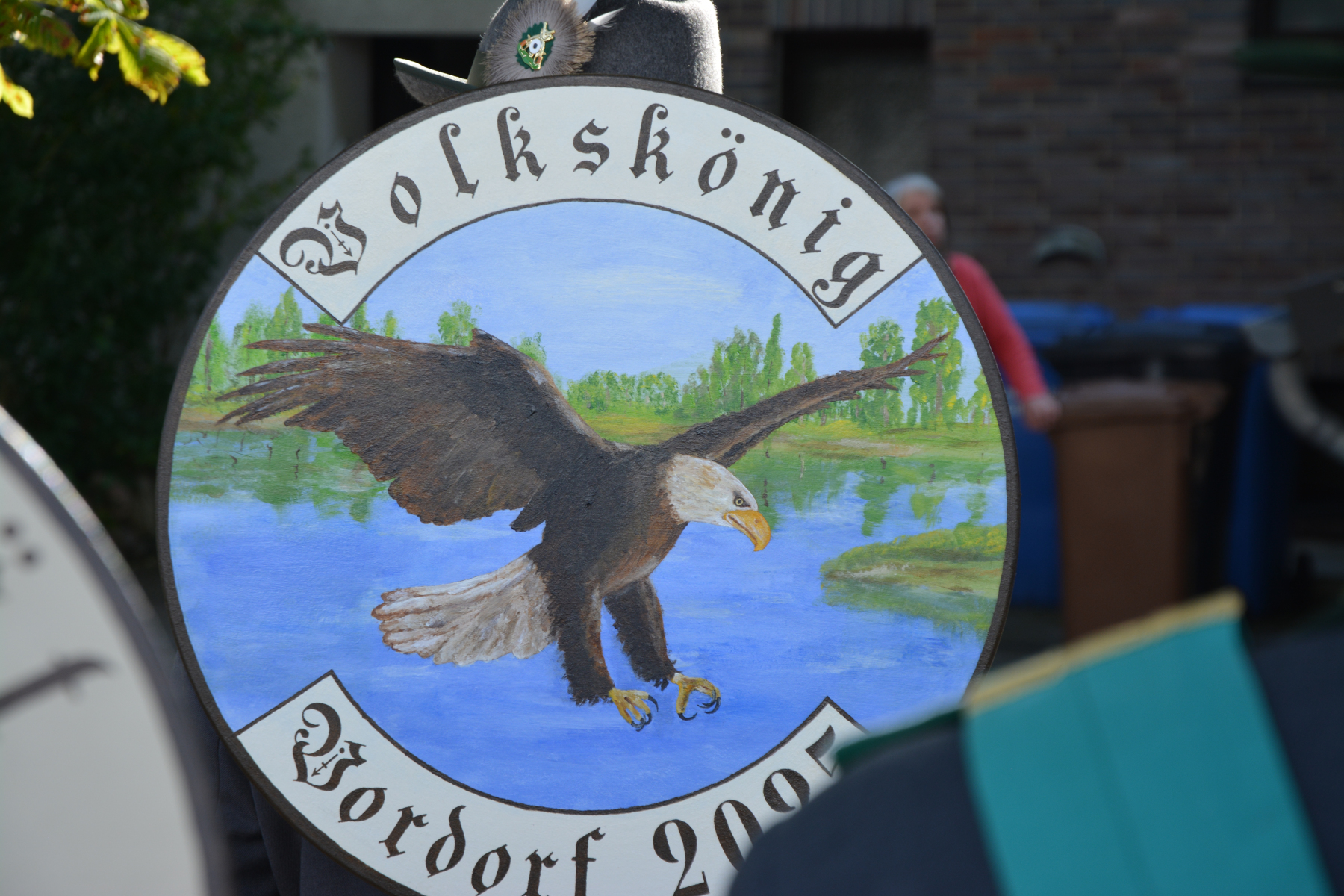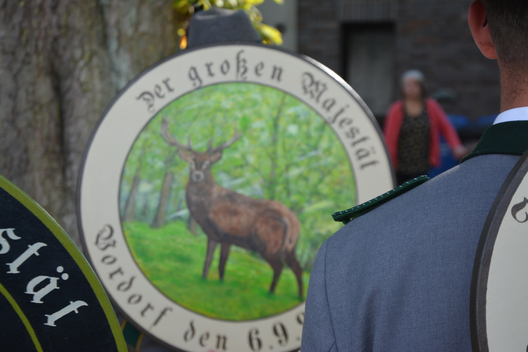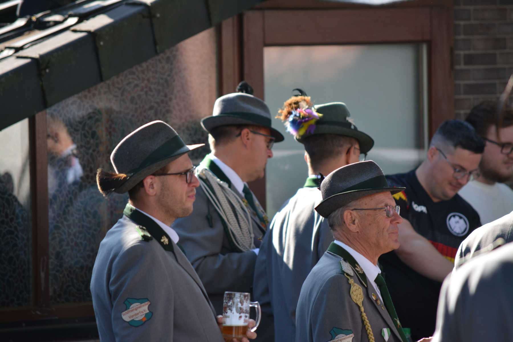 Nach dem Ehrentanz der neuen Würdenträger und dem Fotografieren des neuen Königshauses setzte sich der Umzug wieder in Bewegung. Zuerst wurde die Scheibe der Schwarzen Majestät Mario Heine angebracht und mit Säbeltanz und Kaltgetränken angemessen zelebriert. Nun ging es weiter zum Jugendkönig Bennet Busch. Auch hier wurde die Scheibe der Jugendmajestät fachmännisch angebracht und mit kaltem Wolters begossen. Nun ging es zurück auf den Festplatz.