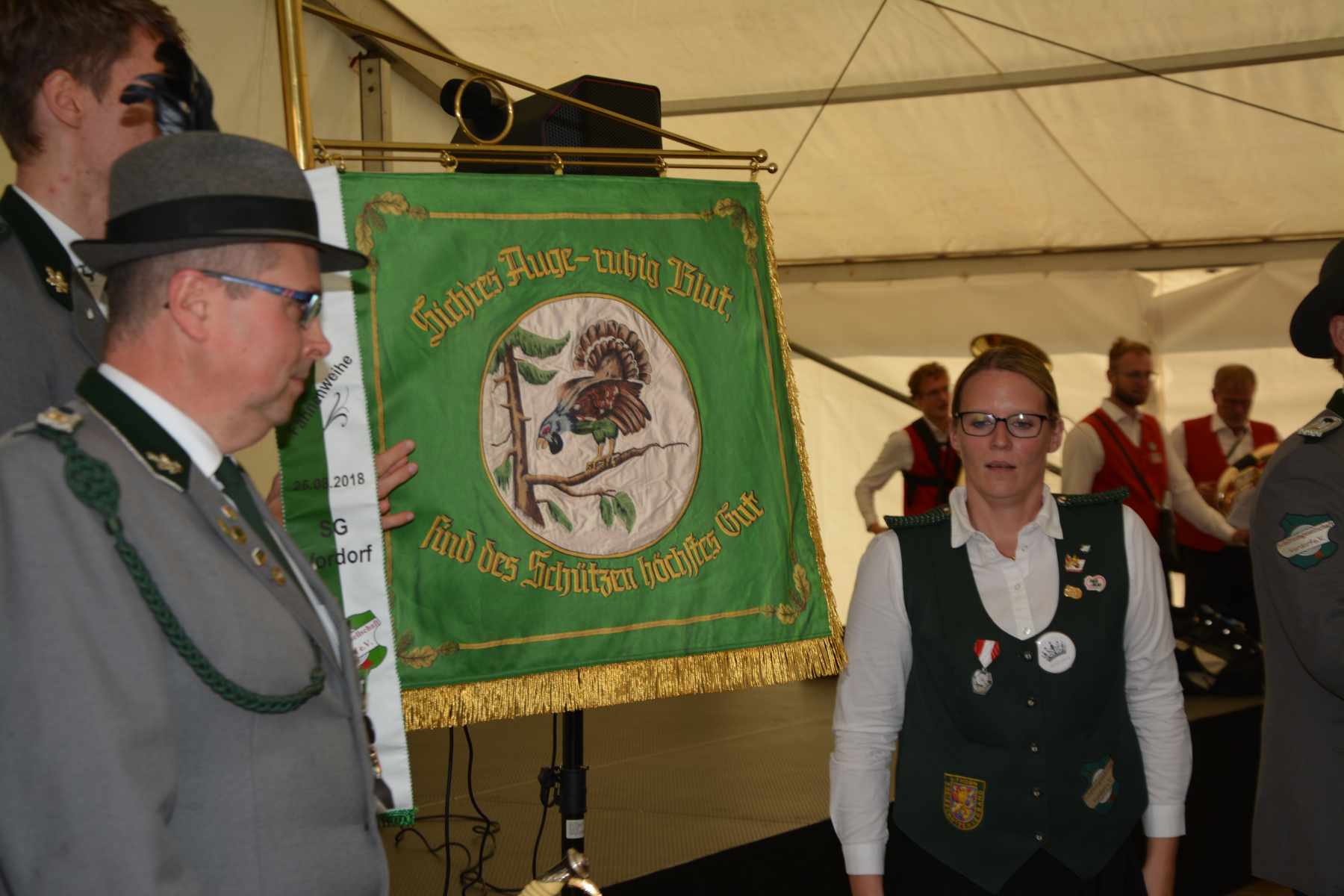 Nun ging es unter musikalischer Begleitung auf das rappelvolle Festzelt zum Königsfrühstück. Der Weckzug wurde von den Gästen mit stehenden Ovationen auf dem Festzelt begrüßt. Der 1. Vorsitzende Glenn Köhler begrüßte besonders die amtierenden Majestäten, sowie die Ehrengäste aus der Politik des Landes, des Kreises, Samtgemeinde und Gemeinde Vordorf. Im Anschluss eröffnete er das Königsfrühstück und begrüßte die Anwesenden der Gastvereine, sowie die vielen anwesenden Vordorfer Bürger. Glenn Köhler gedachte noch einmal den verstorbenen Landrat Tobias Heilmann, der in den letzten Jahren immer ein gern gesehener Gast auf dem Vordorfer Königsfrühstück war und zeigte sich erfreut, dass sich die beiden Kandidaten auf seine Nachfolge Philipp Raulfs und Telse Dirksmeyer-Vielhauer zu Grußworten einfanden. Auch unsere Schützenschwester und Samtgemeindebürgermeisterin Ines Kielhorn und Schützenbruder und Gemeindebürgermeister Frank Engeler bedachten uns mit Grußworten und mit „Knisterumschlägen“. Zudem gab es jeweils 50 Liter Freibier vom Hofbräuhaus Wolters Vertreten durch Andreas Matecki, sowie von unserer Festwirtin Petra Fichtelmann und von der Schützengesellschaft Vordorf. Glenn bedankte sich bei den vielen Sach- und Geldspenden und verlas die Gönner, die nochmal gesondert aufgelistet sind. Ohne Euch ist viel gewollt, aber nur begrenzt möglich!!!!