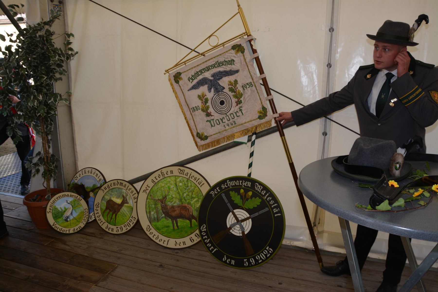 Ein Tisch, ein Stein, ein Hammer, ein Sparschwein… Auch in diesem Jahr wurde wieder traditionell das „Steineklopfen“ auf dem Königsfrühstück durchgeführt. Hier werden wieder die kleinen und größeren „Vergehen“ einzelner während des Schützenfestes geahndet und vorgelesen. Der Deliquent muss dann nach vorne kommen und erkennt mit einem Hammerschlag auf den Stein seine „Straftat“ an und zahlt einen Betrag in selbstgewählter Höhe in das Sparschwein. Die verschiedenen Vergehen erstrecken sich von unkorrekter Schützenkleidung, bis zu vorlauten Zwischenrufen hin bis zur Erzeugung schlechter Luft innerhalb des Umzugs. Entsprechend laut beim Vorlesen waren die Lacher auf dem Zelt. Die eingesammelten Gelder werden wieder einem guten Zweck zugute geführt und gehen in diesem Jahr an die Hospizarbeit Gifhorn. Wie vom Publikum gewünscht wurde im Anschluss das Sparschwein wieder durch die Reihen der Tische gereicht und es wurde eine beachtliche Summe von 1.030,00€ erzielt, welche zeitnah übergeben werden. Dafür bedankt sich die SG Vordorf bei allem von Herzen!!! Zudem erfreuten sich die Gäste an der tollen Preispalette der Tombola unter der Leitung der Vereinskassiererin Tanja Brandes und ihrer Vertreterin Steffi Rick. Bis zum späten Nachmittag saß man zusammen, feierte und klönte. Bei Sonnenschein klang das durchweg gelungene Schützenfest 2025 im Jugendclub aus.
