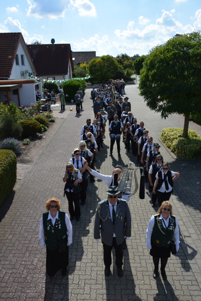 Nachdem es zwei Tage durchgehend geregnet hat schloss der Himmel rechtzeitig seine Schleusen und wartete am 5. September mit blauem Himmel und Prachtwetter auf. Die Schützendamen dekorierten mit gesammelten Blumen die Tische im Festzelt. Der Jugendclub mit vielen Jungschützen schmückte bereits eine Woche zuvor unter Mithilfe vom Eickenhof die Dorfstraßen mit Girlanden, welche von den Mitbürgern mit Dankbarkeit angenommen wurden. Die Schützenschwestern und Brüder trafen um 15:45 Uhr am Festplatz ein und traten um 16 Uhr zur Eröffnung des Schützenfestes in der Weststraße an. Nach den Meldungen des Kommandos eröffnete der 1. Vorsitzende Glenn Köhler das Schützenfest. Der Umzug setzte sich unter dem Kommando von Christian Schnelle und musikalischer Begleitung durch den Feuerwehrmusikzug Meine in Bewegung und holte die amtierende große Majestät Merrit Ungar mit Adjutantin Stefanie Rick zum Festplatz ab.