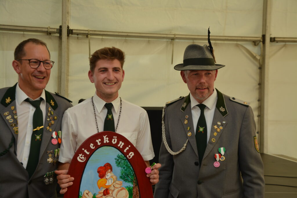 Die beiden Männerzüge saßen bei kaltem Bier und Fischbrötchen in gewohnt gemütlicher Runde beisammen und der Spielmannzug Altencelle verabschiedete sich mit gewohnt hoher musikalischer Qualität. Die Schützenschwestern und Brüder bedachten die Freunde aus Altencelle zusätzlich mit einer Kollekte für ihre Jugend- und Nachwuchsarbeit. Nun versammelte der 3. Zug sich traditionell an der Schießbude, um den neuen Eierkönig zu ermitteln. Dieser wurde Nico Engeler, welcher sogleich auf dem Festzelt unter großem Beifall durch das Eierkommando proklamiert wurde.
