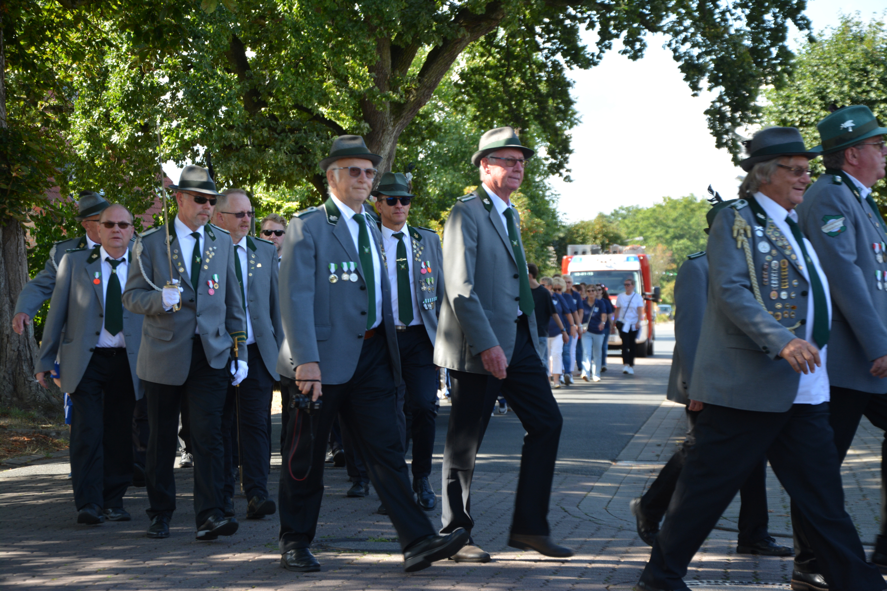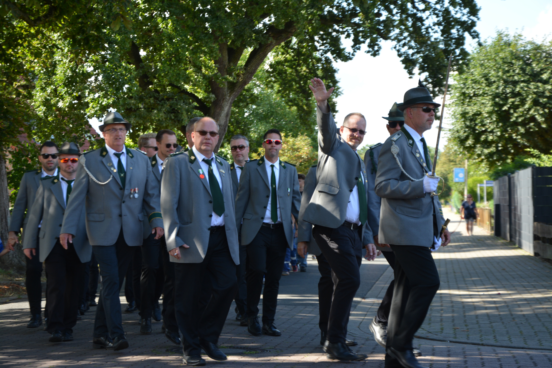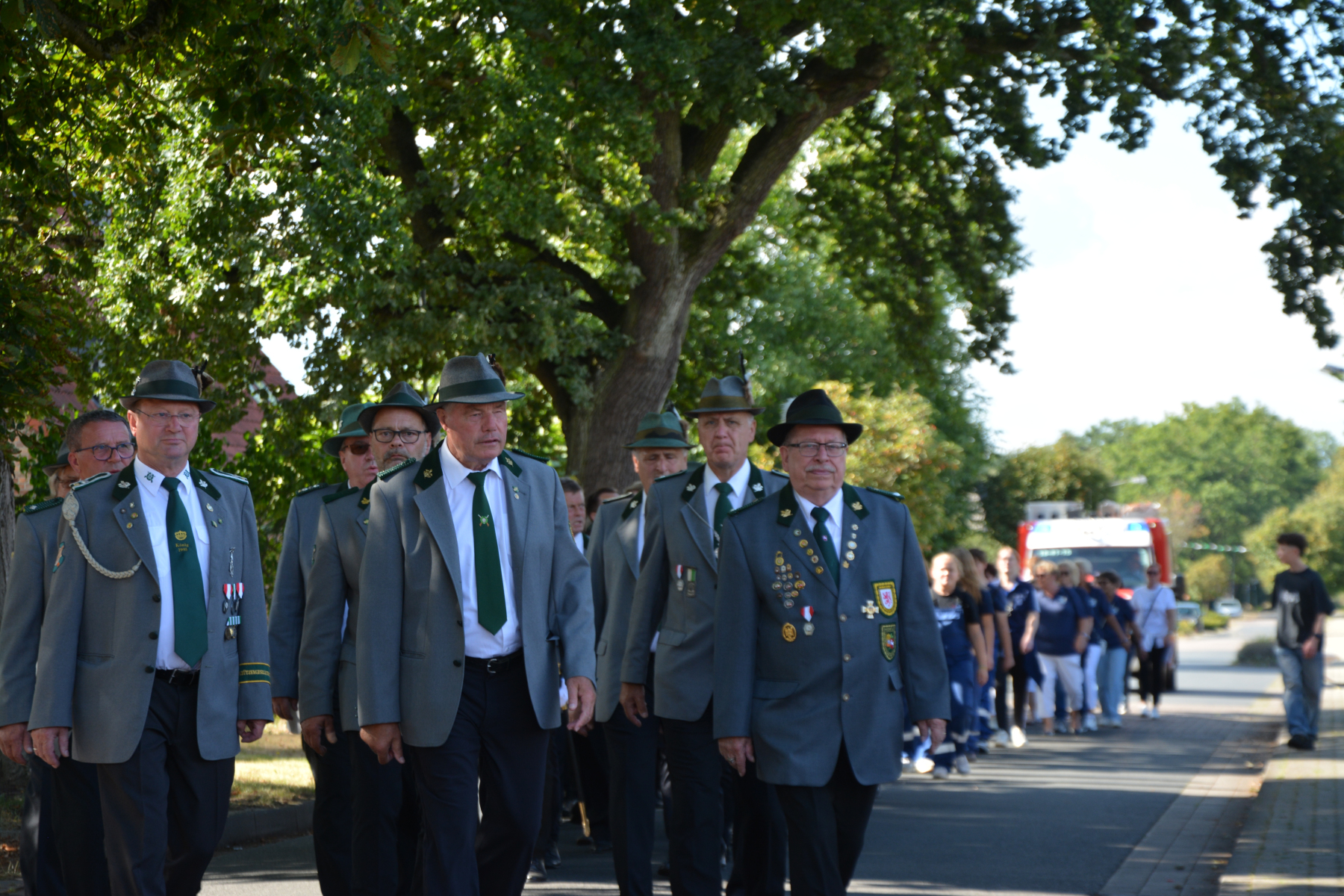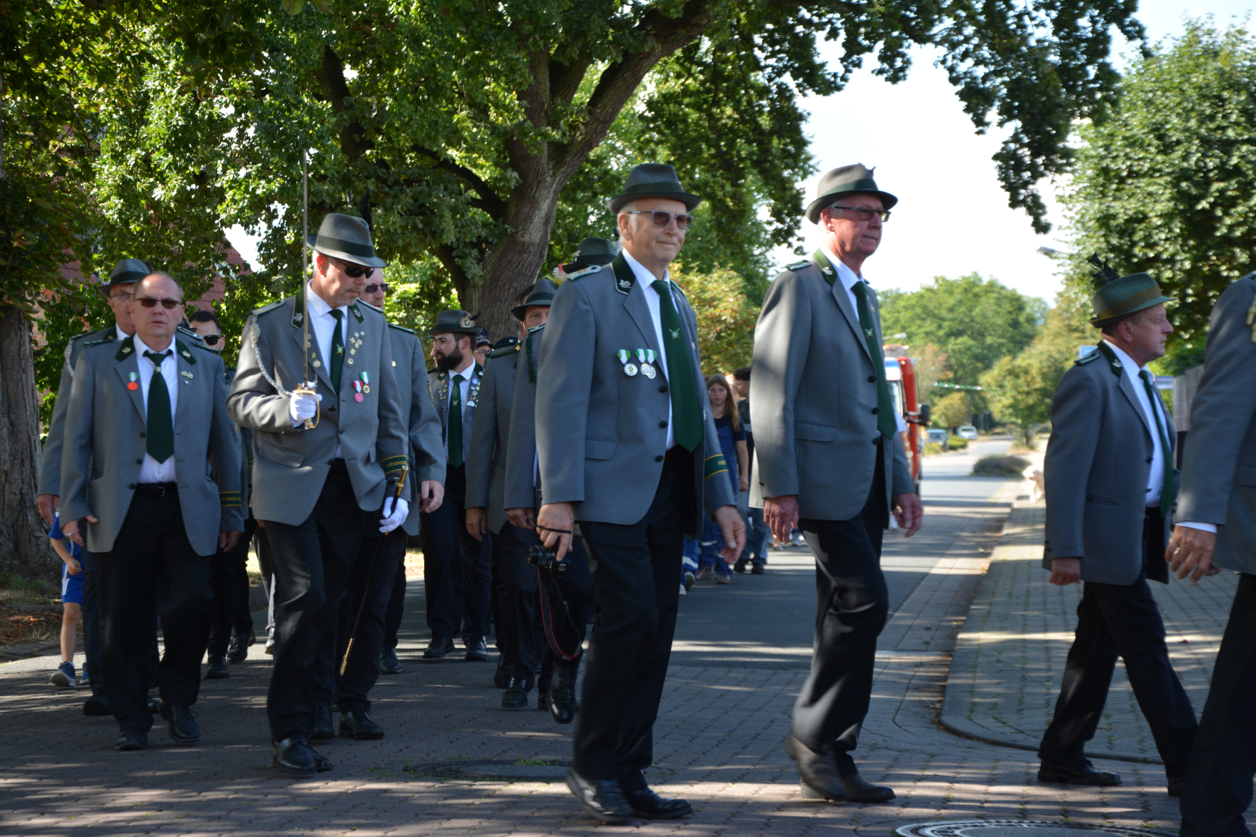 Um 13 Uhr wurde dann zum großen Festumzug unter musikalischer Begleitung durch den fantastischen Spielmannzug Altencelle angetreten. Hier kamen viele TSV-Sportler hinzu, sowie die Jugend- und Kinderfeuerwehr, die unserer Einladung zum großen Festumzug gerne gefolgt sind. Zuerst ging es zum Kriegerdenkmal am Kaisergarten zur Kranzniederlegung durch den Vorstand der Schützengesellschaft. Im Anschluss setzte der Umzug seinen Marsch durch das Dorf mit Einbindung eines Getränkestopps zur großen Majestät Hans-Jürgen Knuth fort. Auch dort wurde die Scheibe fachmännisch von unseren Scheibenträgern angebracht und der Säbeltanz zelebriert.