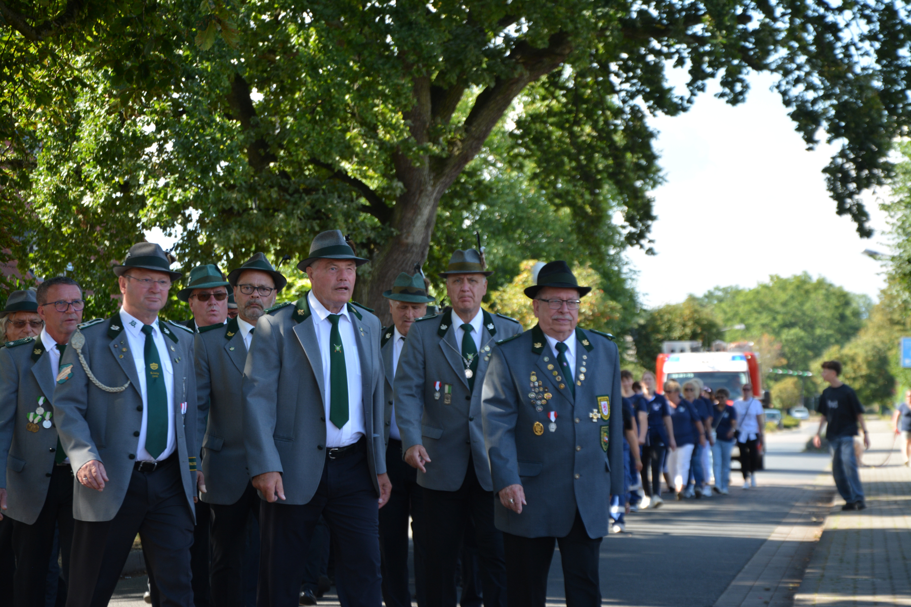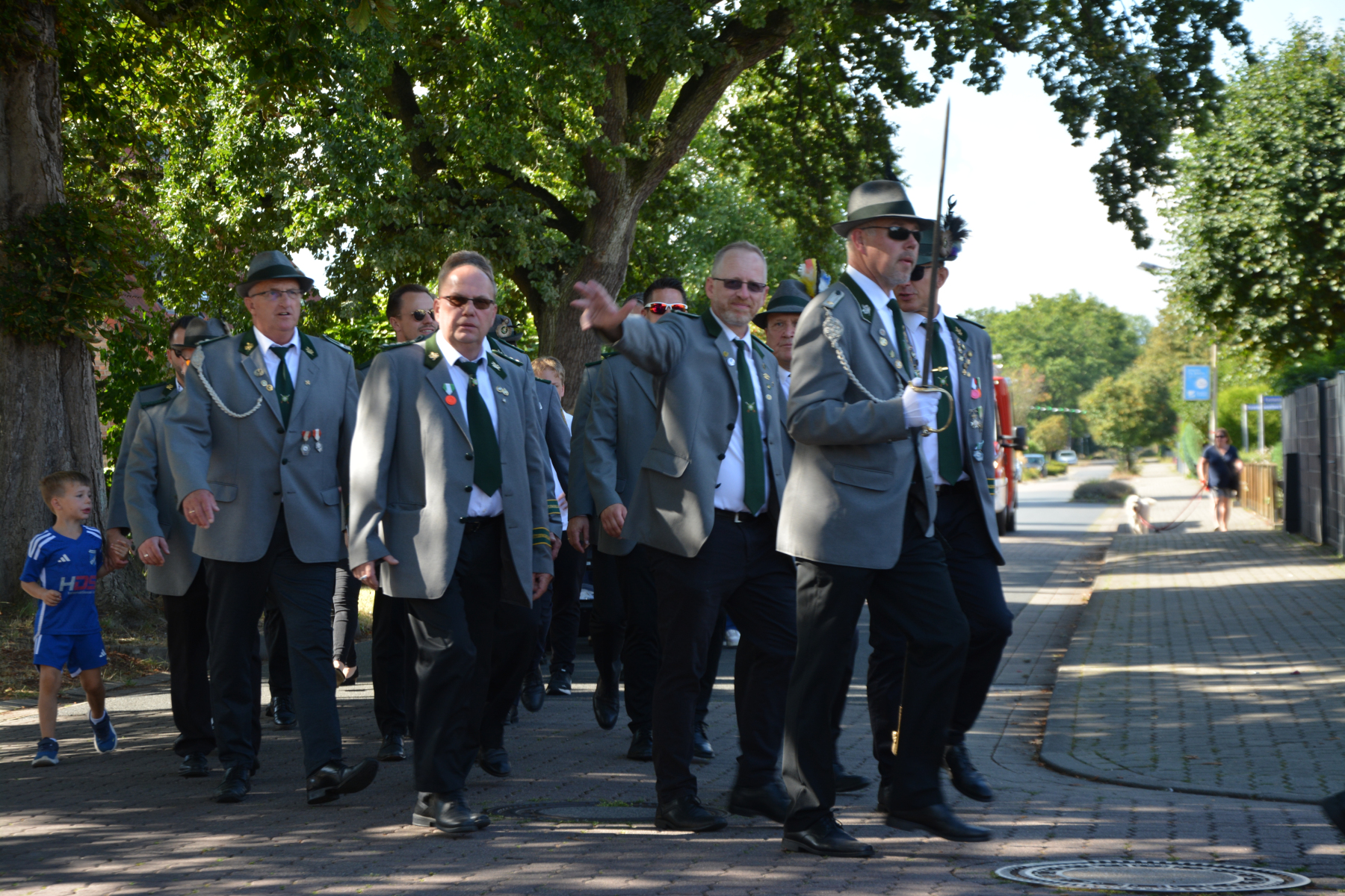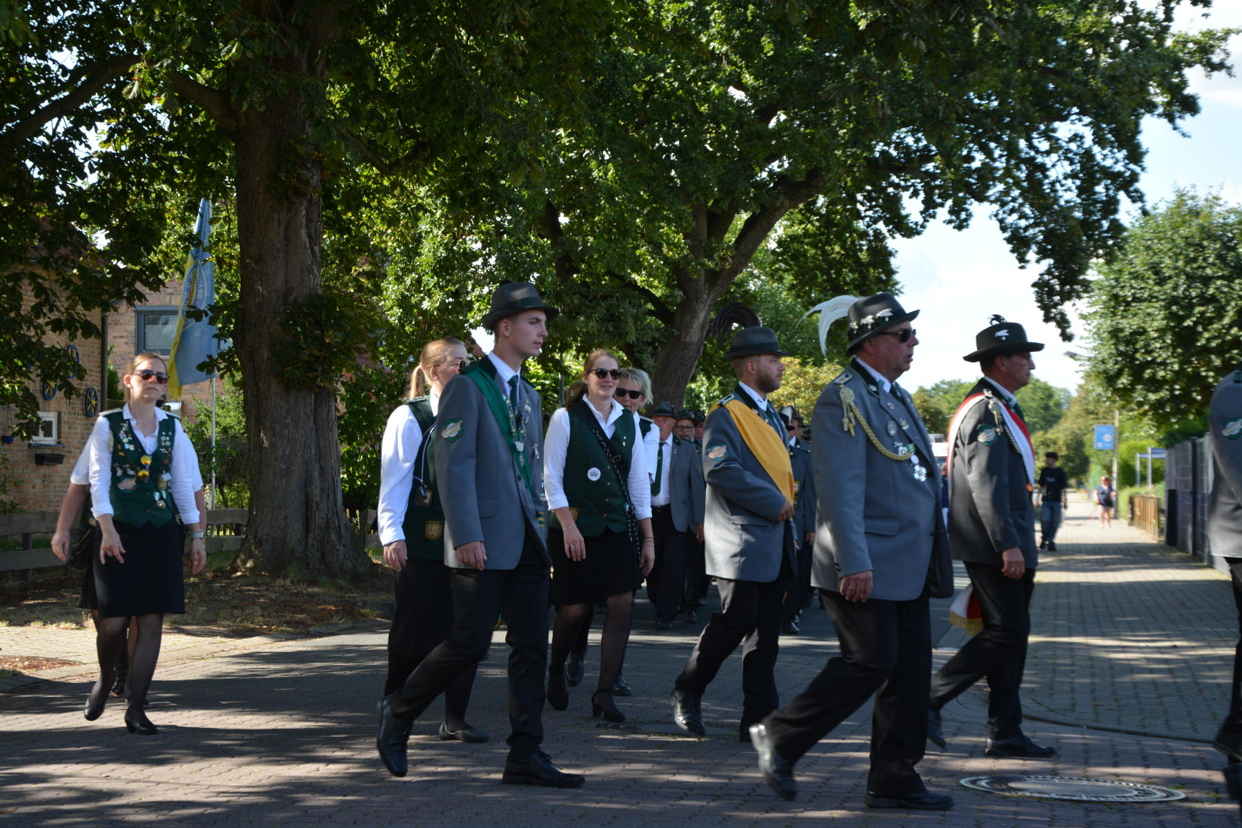 Um 13 Uhr wurde dann zum großen Festumzug unter musikalischer Begleitung durch den fantastischen Spielmannzug Altencelle angetreten. Hier kamen viele TSV-Sportler hinzu, sowie die Jugend- und Kinderfeuerwehr, die unserer Einladung zum großen Festumzug gerne gefolgt sind. Zuerst ging es zum Kriegerdenkmal am Kaisergarten zur Kranzniederlegung durch den Vorstand der Schützengesellschaft. Im Anschluss setzte der Umzug seinen Marsch durch das Dorf mit Einbindung eines Getränkestopps zur großen Majestät Hans-Jürgen Knuth fort. Auch dort wurde die Scheibe fachmännisch von unseren Scheibenträgern angebracht und der Säbeltanz zelebriert.