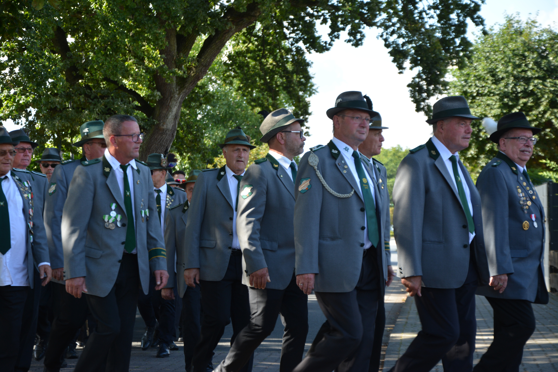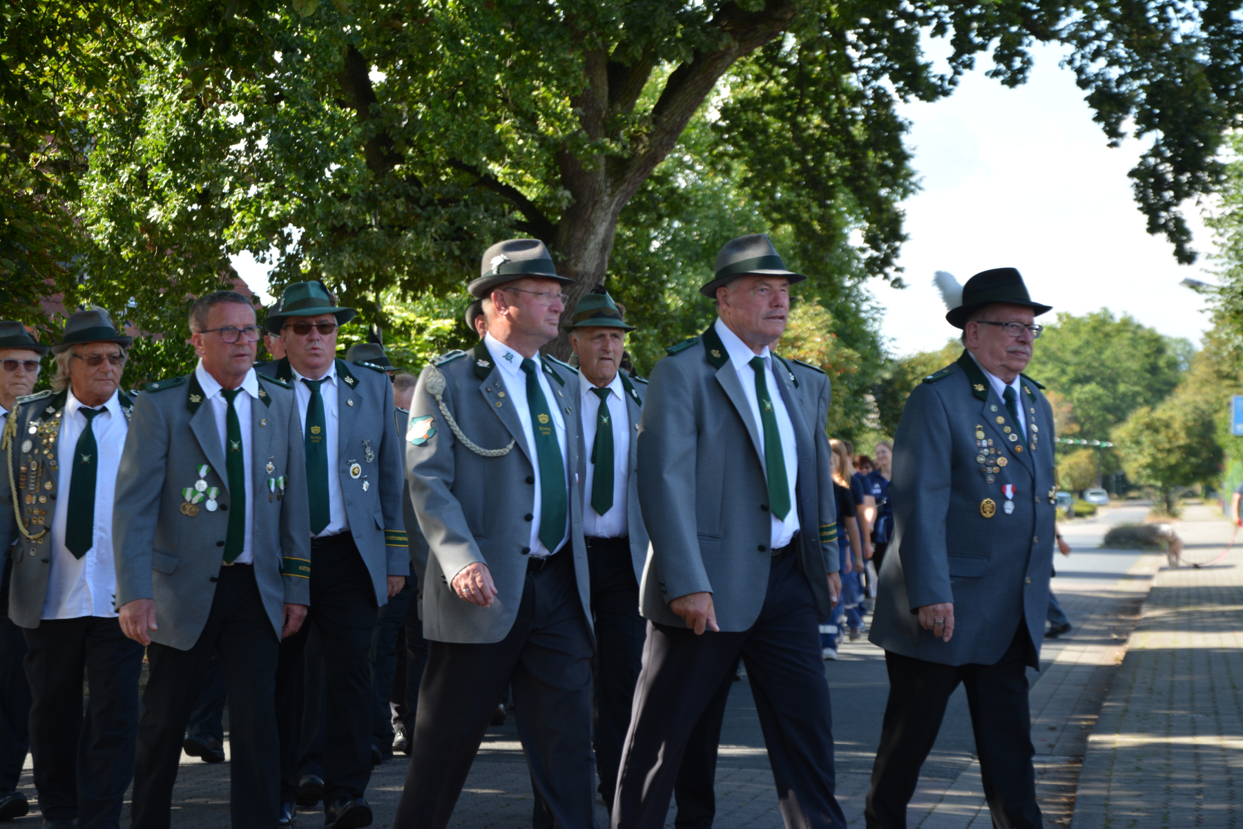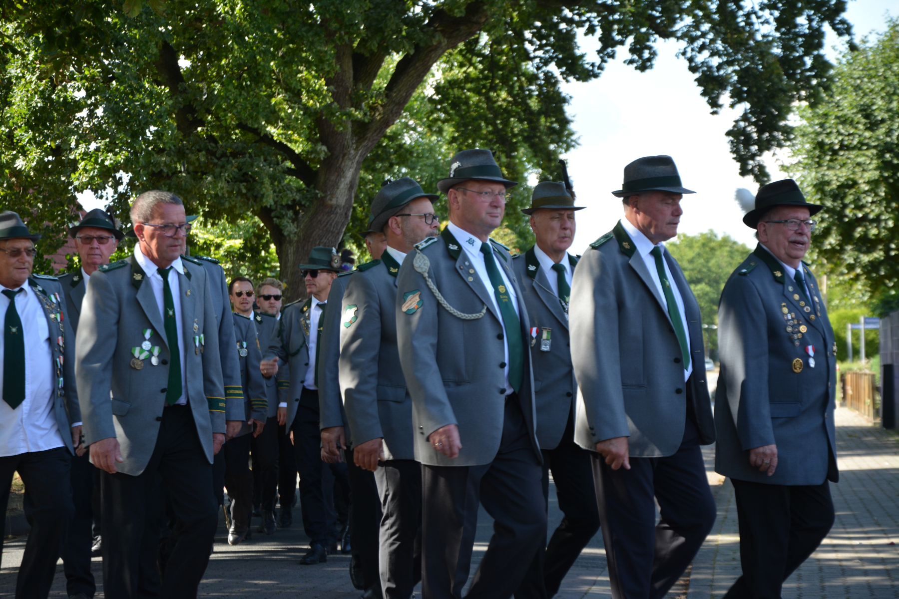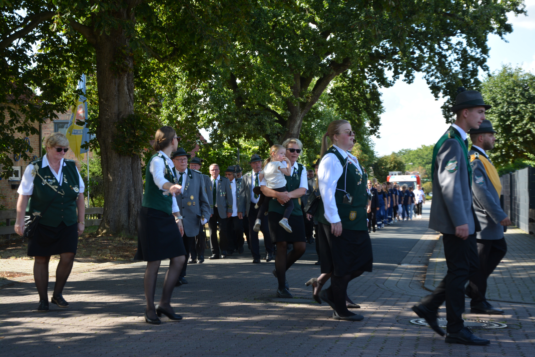 Um 13 Uhr wurde dann zum großen Festumzug unter musikalischer Begleitung durch den fantastischen Spielmannzug Altencelle angetreten. Hier kamen viele TSV-Sportler hinzu, sowie die Jugend- und Kinderfeuerwehr, die unserer Einladung zum großen Festumzug gerne gefolgt sind. Zuerst ging es zum Kriegerdenkmal am Kaisergarten zur Kranzniederlegung durch den Vorstand der Schützengesellschaft. Im Anschluss setzte der Umzug seinen Marsch durch das Dorf mit Einbindung eines Getränkestopps zur großen Majestät Hans-Jürgen Knuth fort. Auch dort wurde die Scheibe fachmännisch von unseren Scheibenträgern angebracht und der Säbeltanz zelebriert.