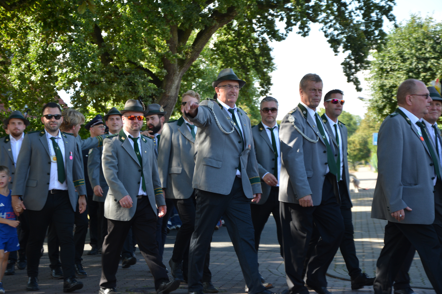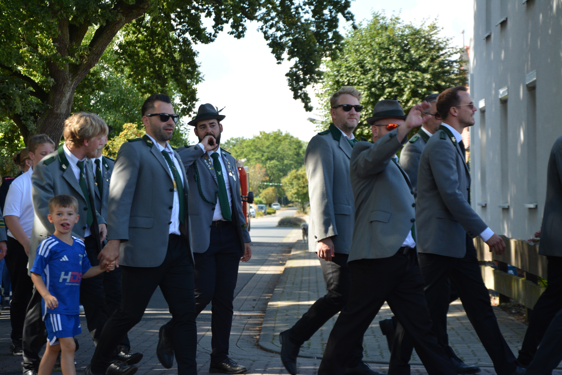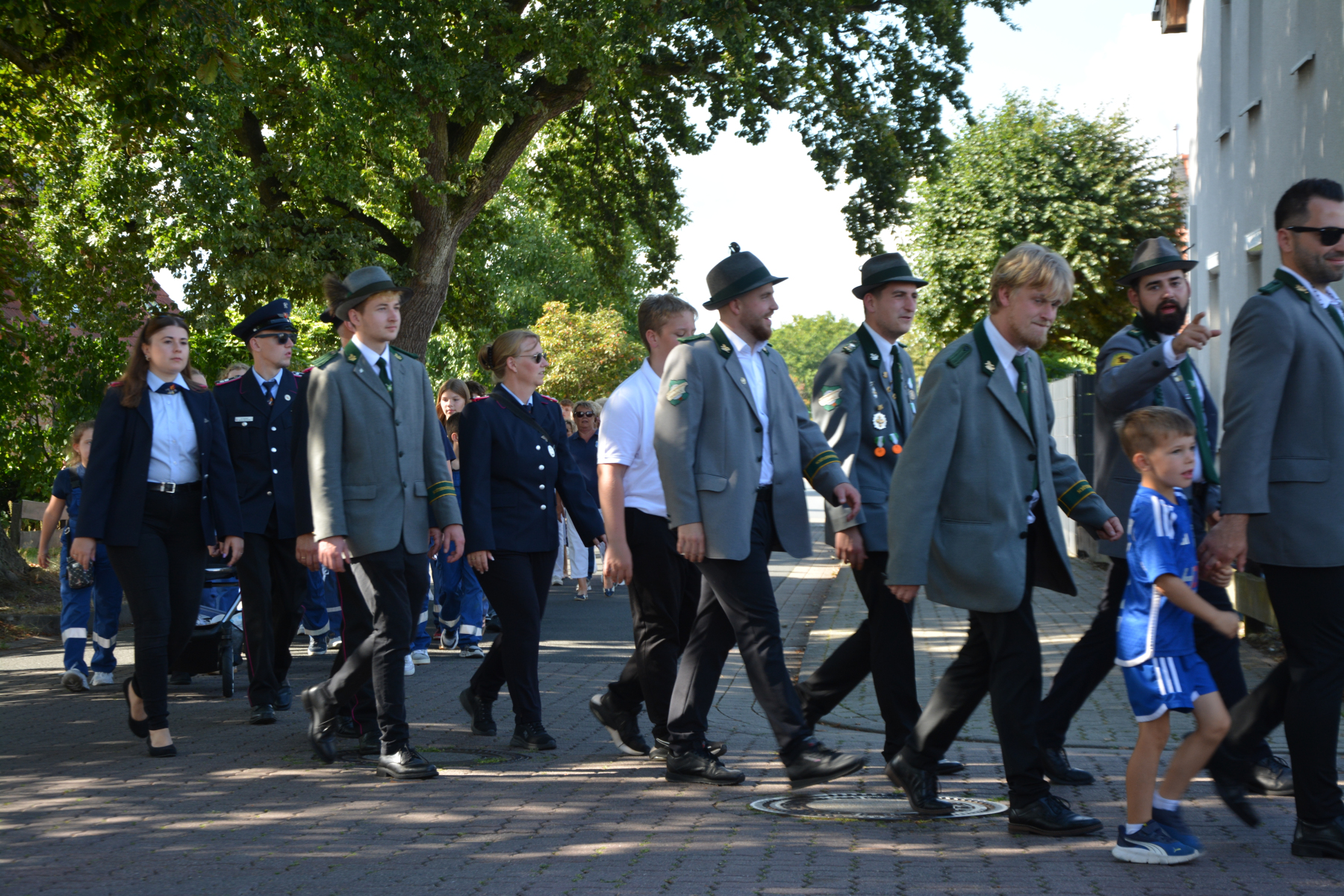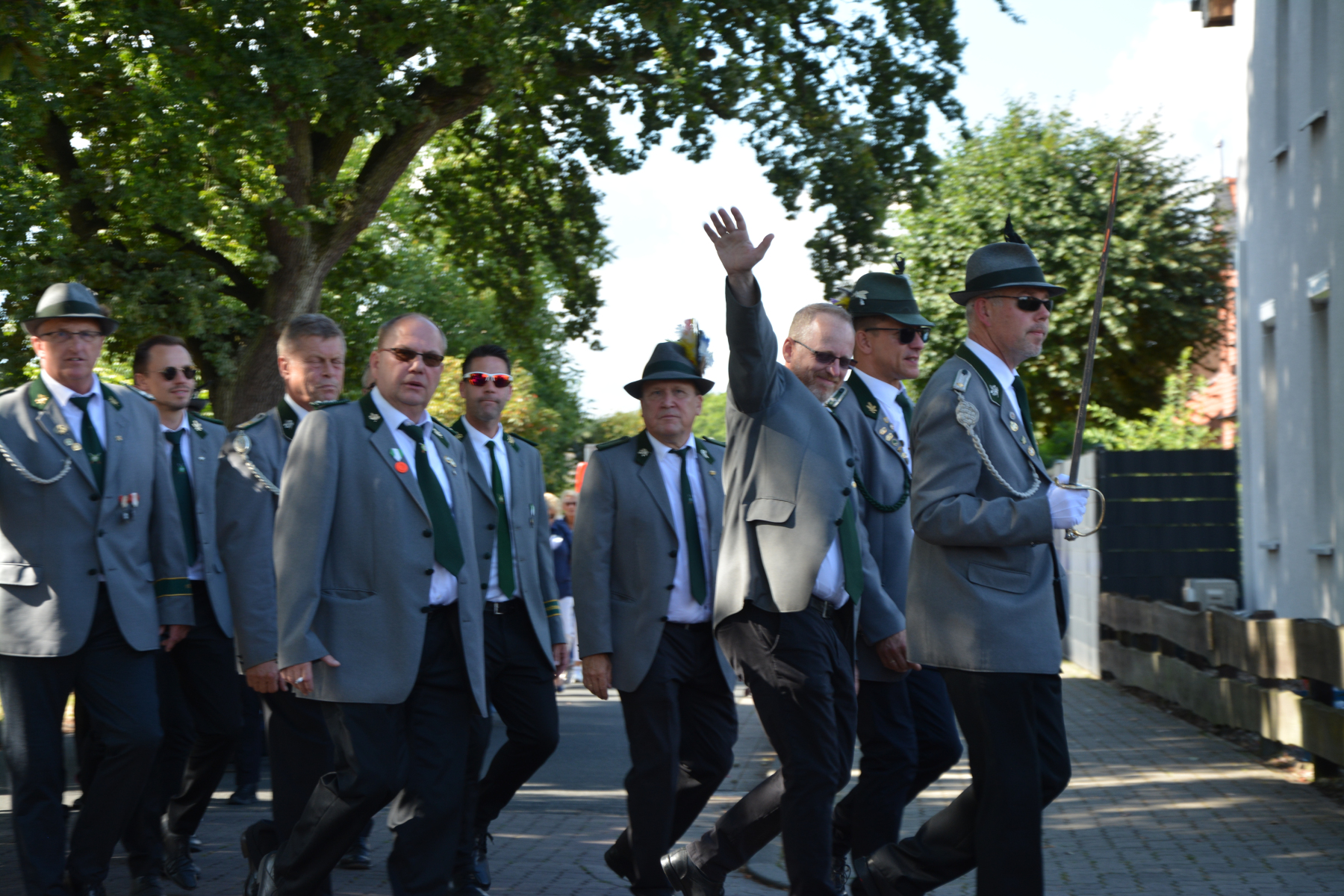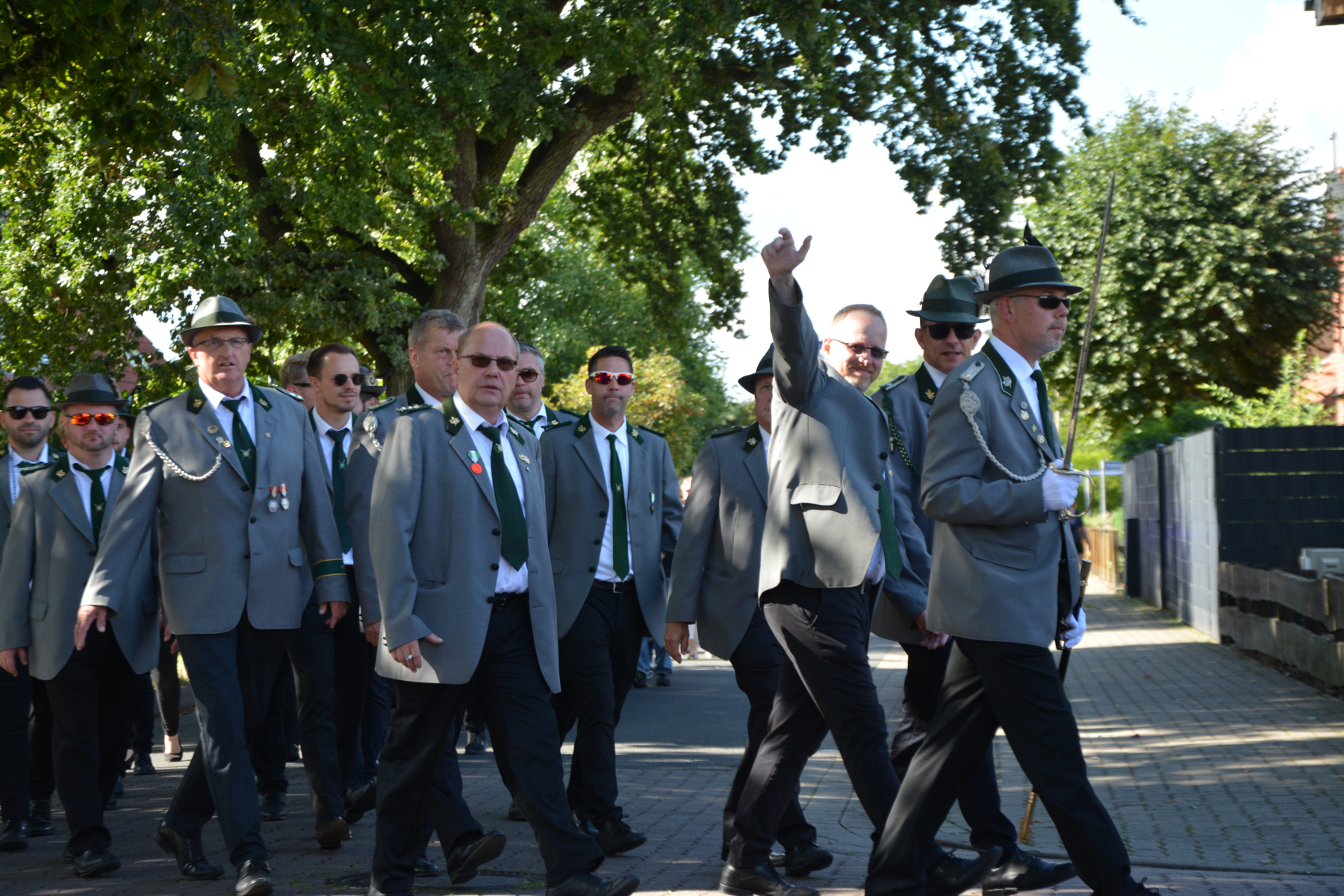 Um 13 Uhr wurde dann zum großen Festumzug unter musikalischer Begleitung durch den fantastischen Spielmannzug Altencelle angetreten. Hier kamen viele TSV-Sportler hinzu, sowie die Jugend- und Kinderfeuerwehr, die unserer Einladung zum großen Festumzug gerne gefolgt sind. Zuerst ging es zum Kriegerdenkmal am Kaisergarten zur Kranzniederlegung durch den Vorstand der Schützengesellschaft. Im Anschluss setzte der Umzug seinen Marsch durch das Dorf mit Einbindung eines Getränkestopps zur großen Majestät Hans-Jürgen Knuth fort. Auch dort wurde die Scheibe fachmännisch von unseren Scheibenträgern angebracht und der Säbeltanz zelebriert.