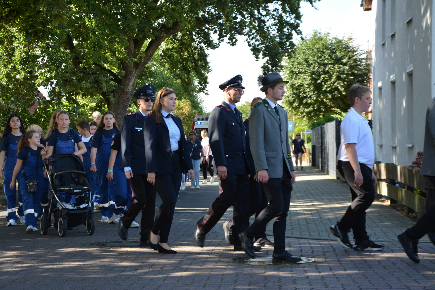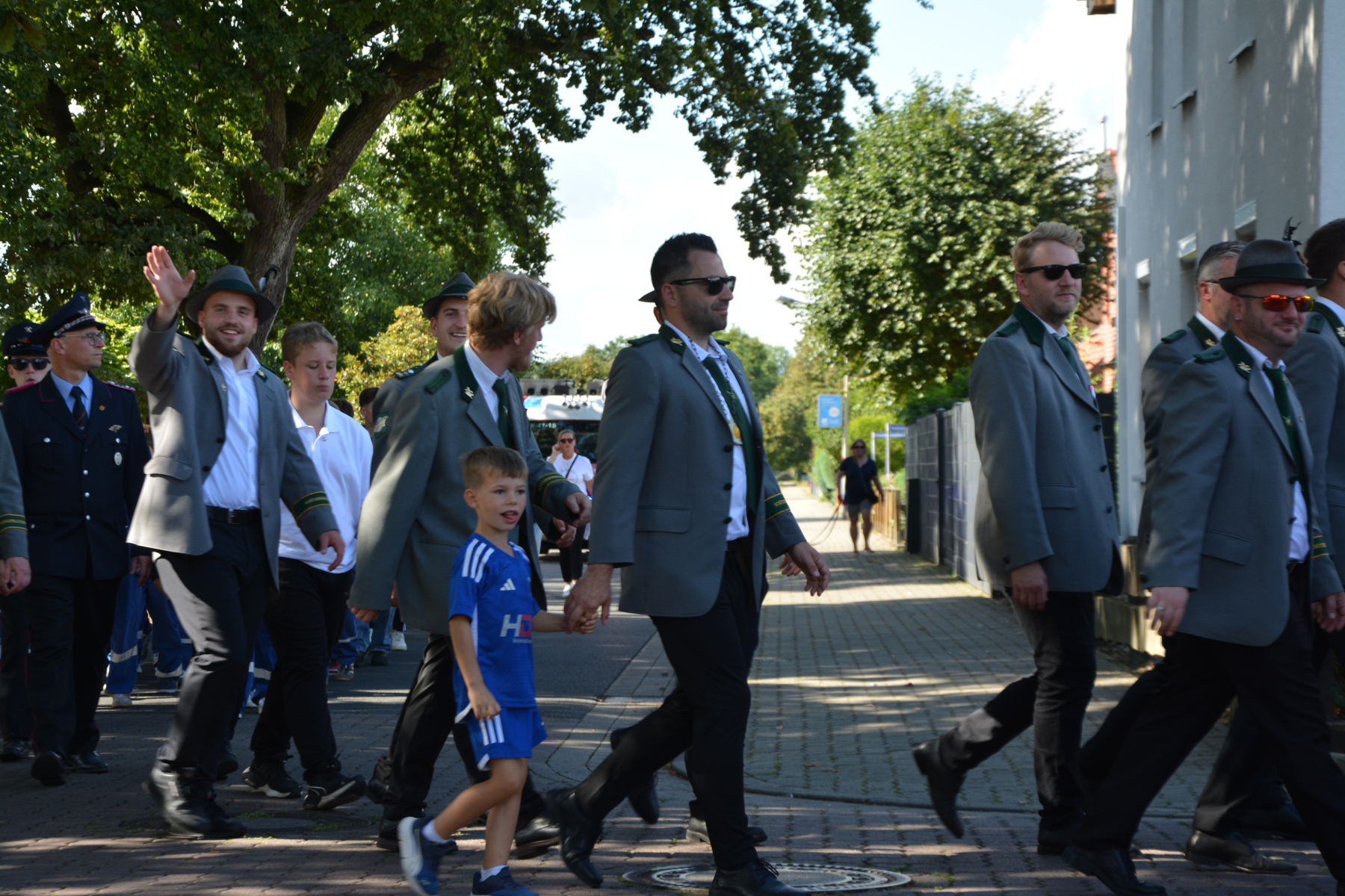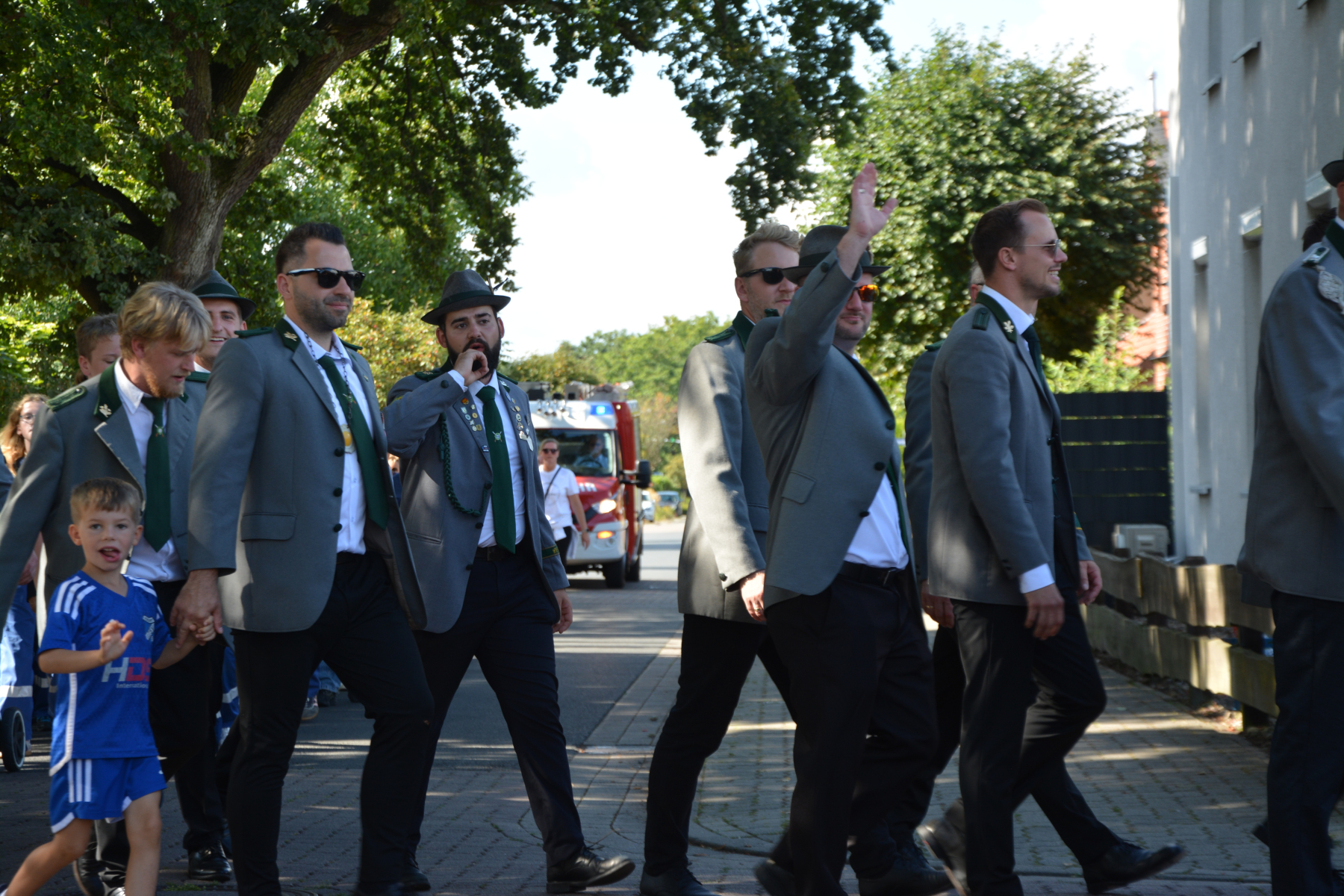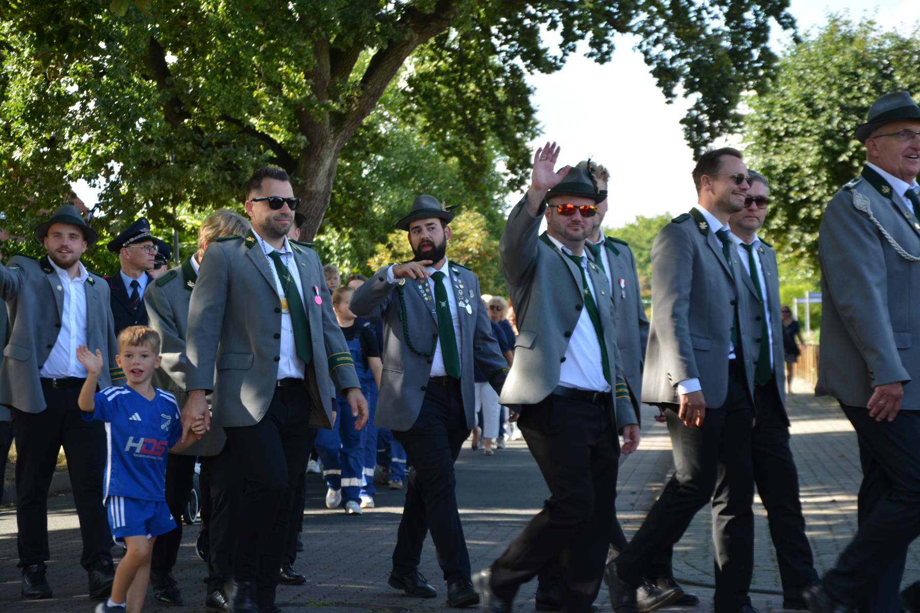 Um 13 Uhr wurde dann zum großen Festumzug unter musikalischer Begleitung durch den fantastischen Spielmannzug Altencelle angetreten. Hier kamen viele TSV-Sportler hinzu, sowie die Jugend- und Kinderfeuerwehr, die unserer Einladung zum großen Festumzug gerne gefolgt sind. Zuerst ging es zum Kriegerdenkmal am Kaisergarten zur Kranzniederlegung durch den Vorstand der Schützengesellschaft. Im Anschluss setzte der Umzug seinen Marsch durch das Dorf mit Einbindung eines Getränkestopps zur großen Majestät Hans-Jürgen Knuth fort. Auch dort wurde die Scheibe fachmännisch von unseren Scheibenträgern angebracht und der Säbeltanz zelebriert.
